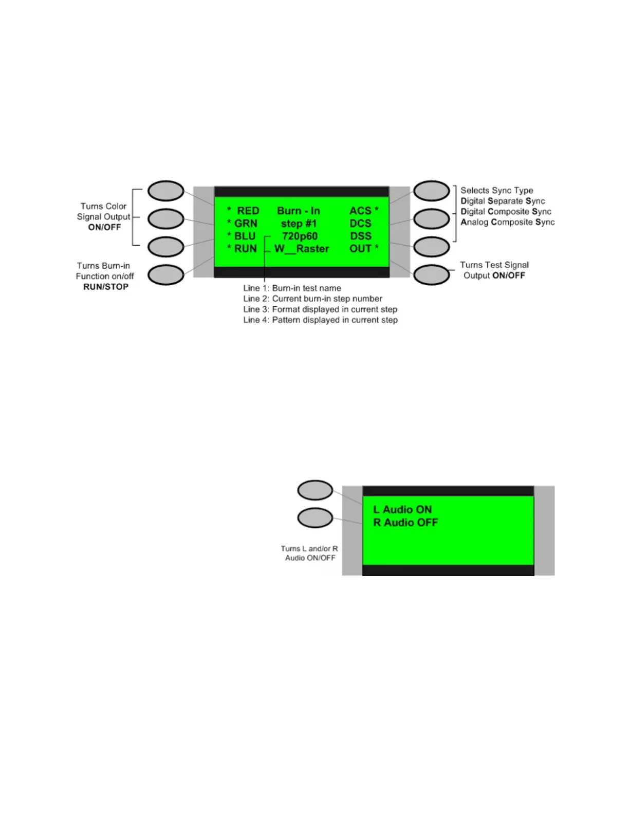 video test patterns for the selected format. The pushbutton to the bottom left of the display is the