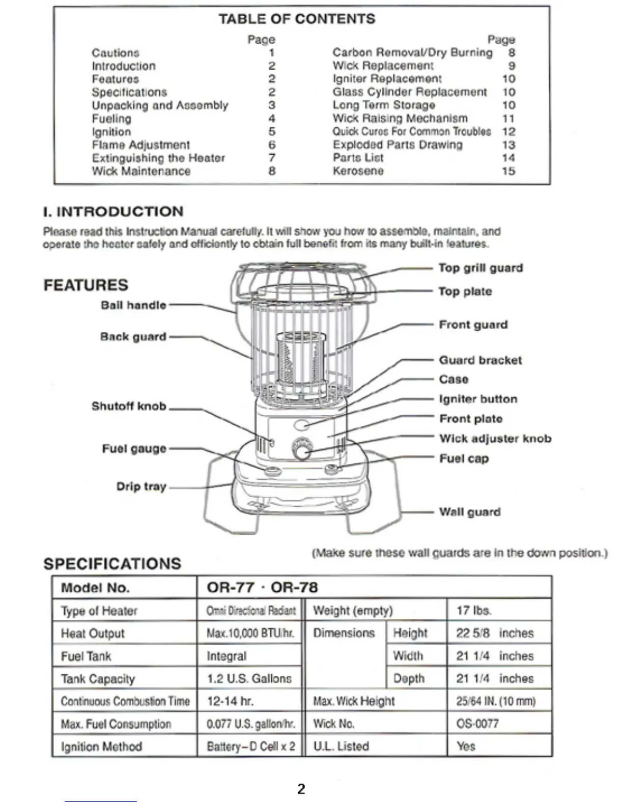Sengoku OR-77 - Product View and Parts Identification; Table of Contents; Specifications