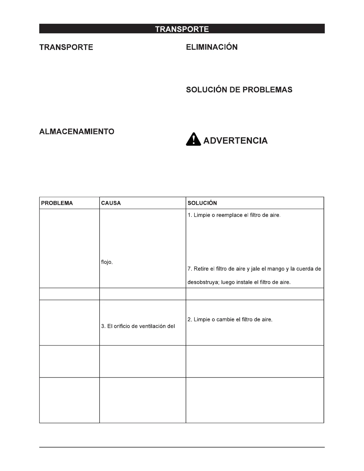 El motor se detiene 1. Se agotó el combustible. 1. Llene el depósito de combustible.