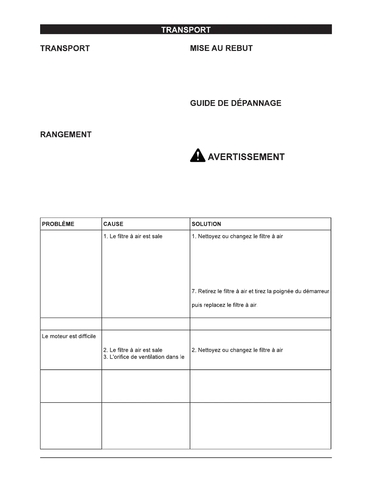 Le moteur s’arrête 1. Il n’y a plus de carburant 1. Remplissez le réservoir de carburant