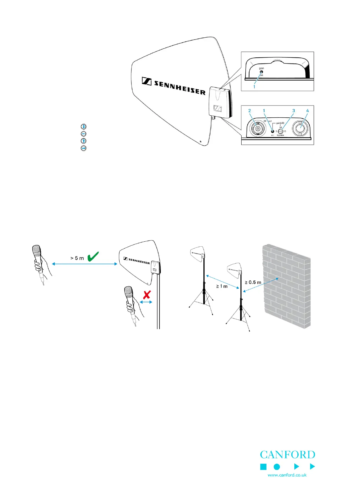 Minimum distance from transmitter to antenna, 5m. Antenna to antenna min distance, 1m. To wall, 0.5m