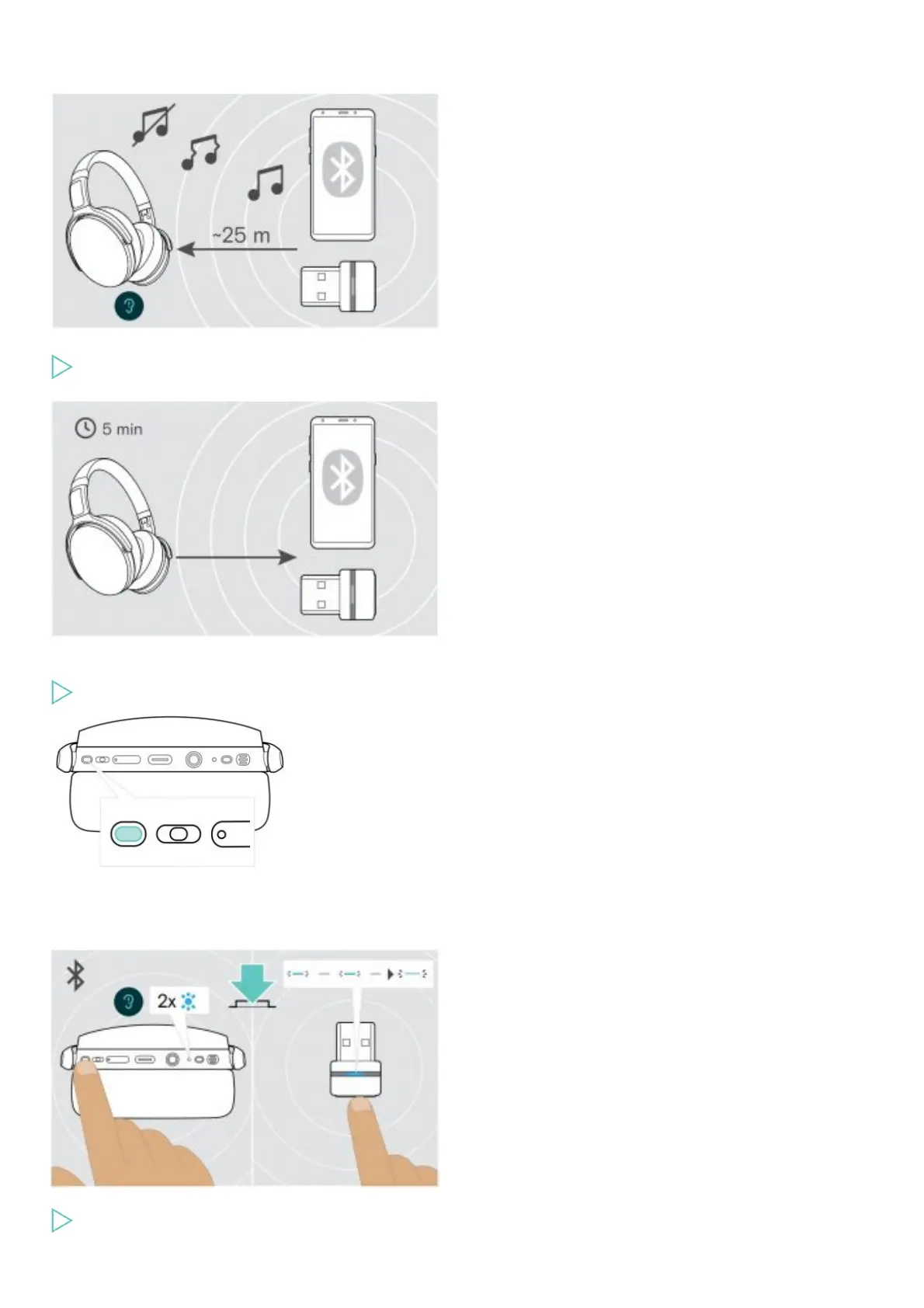 The headset flashes 2 times blue as soon as the headset finds a device to connect to. The dongle flashes blue and lights up dimmed blue.