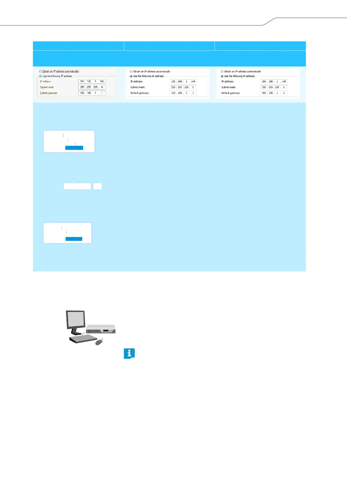왘 Set the device part (the last three digits) of the IP address to a value (“1” – “254”) that is neither used by your PC nor