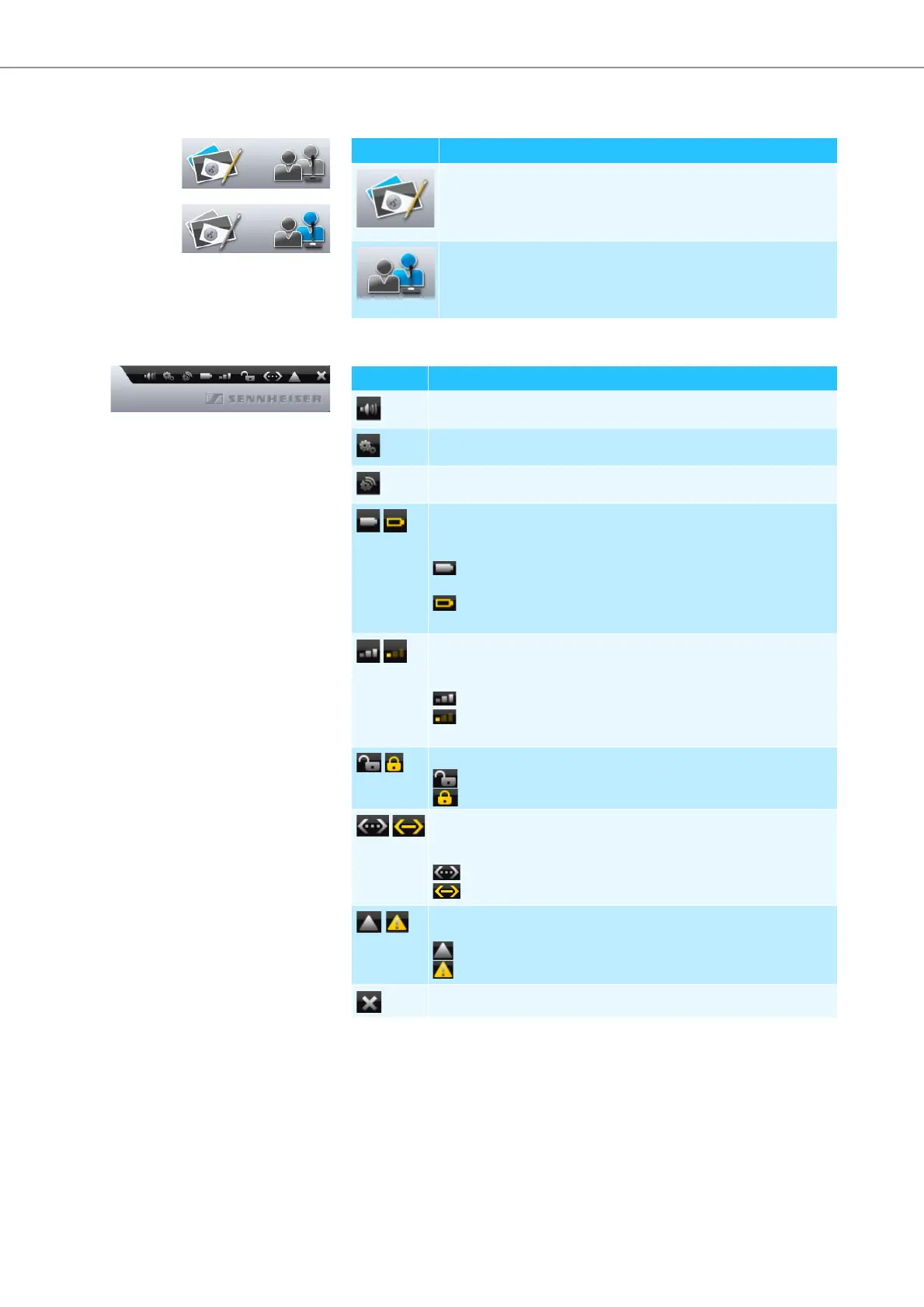 Displays the battery status of the conference units and shows/