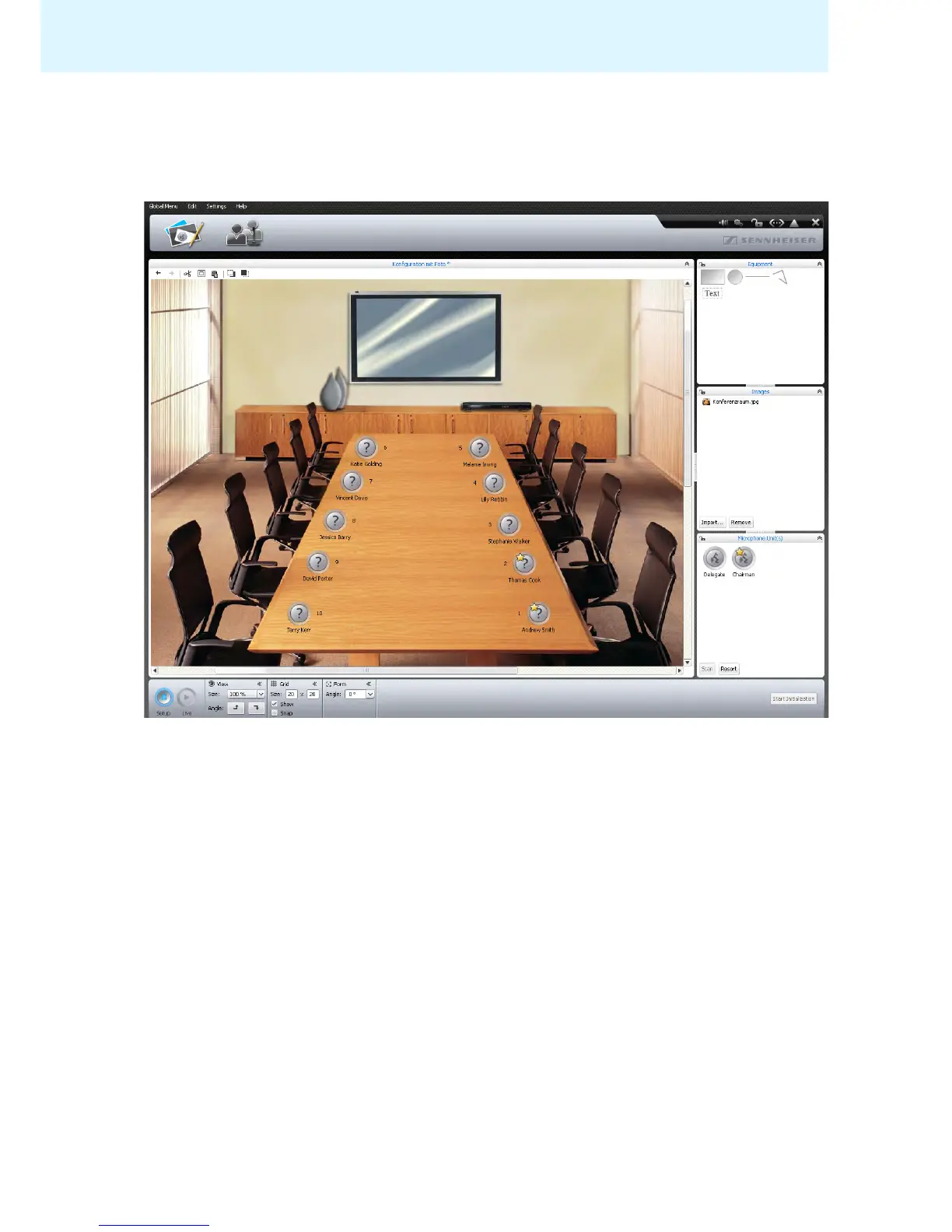 In “Setup” operating mode, you can use photos and graphical elements to map a conference room. Using delegate lists, you