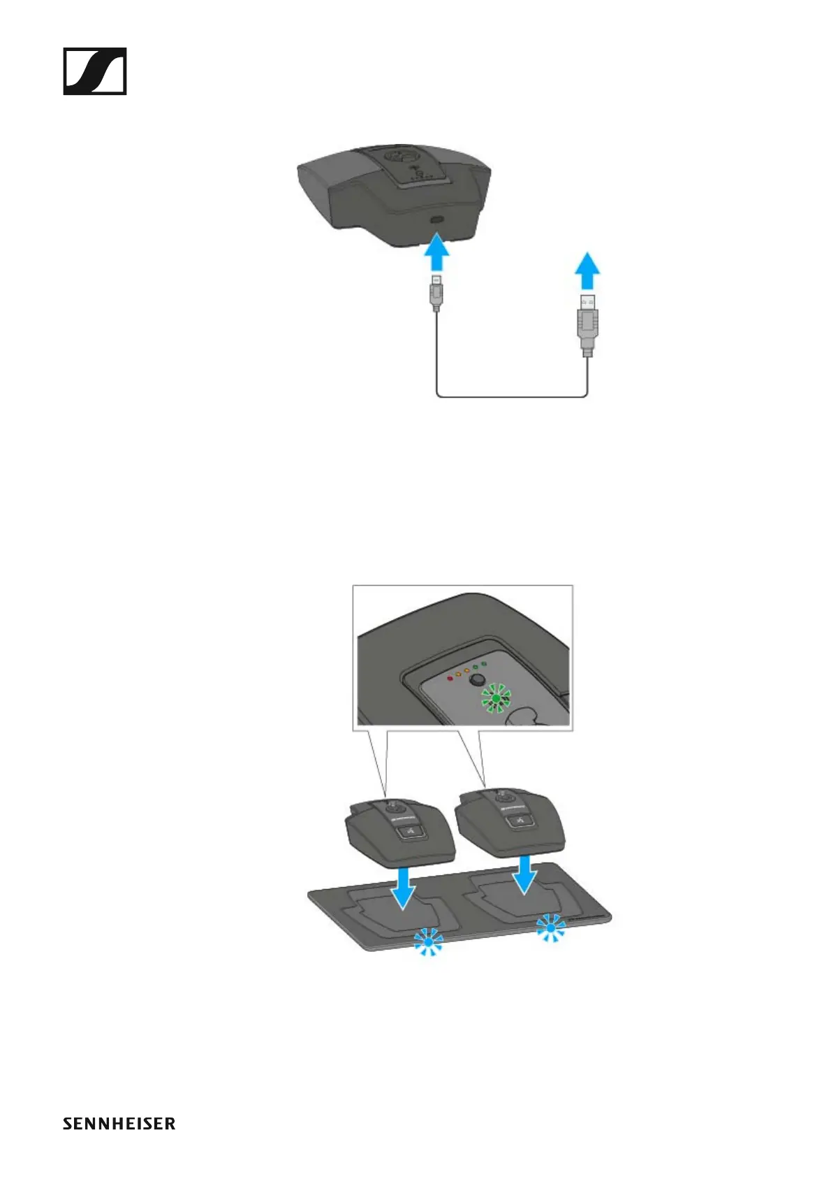 The LEDs on the CHG 2W charging base flash blue during charging.