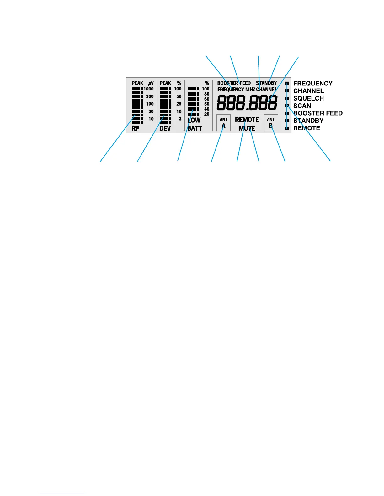 Ten-step bargraph for the received RF signal, with overmodulation display (Peak).