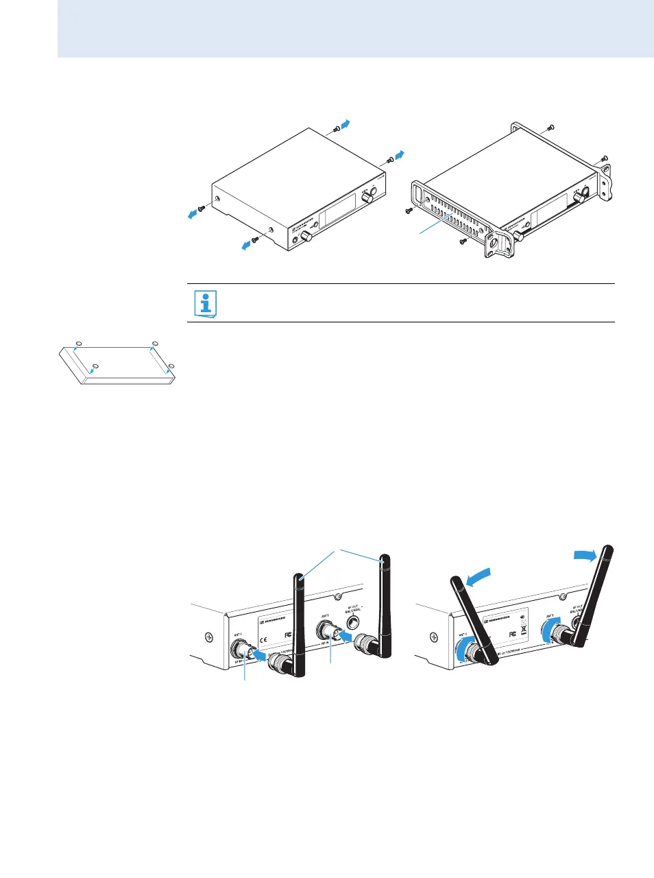 왘 Secure the rack mount “ears” to the sides of the receiver using the