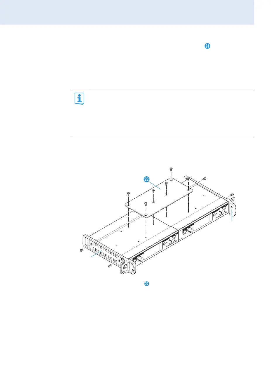 왘 Slide the receiver with the mounted blanking plate into the 19” rack.