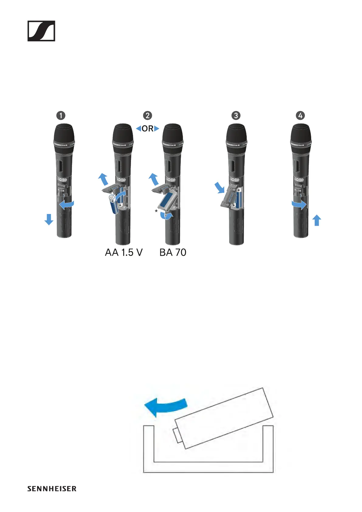 (AA, 1.5 V) or with the rechargeable Sennheiser BA 70 battery.