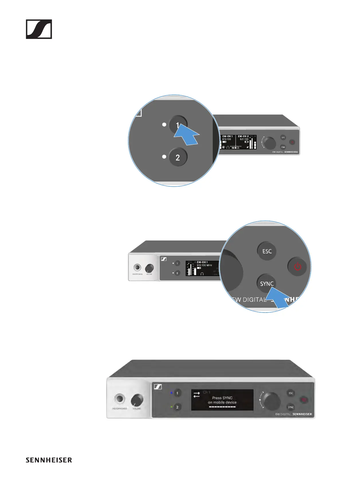 ▷ On the receiver, press the CH 1 or CH 2 button to select the