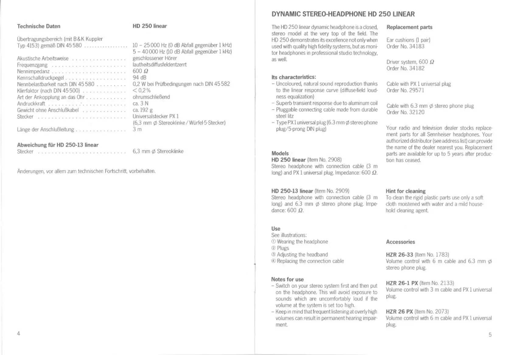 Sennheiser HD 250 - Replacement Parts; Use; Hint for Cleaning; Accessories