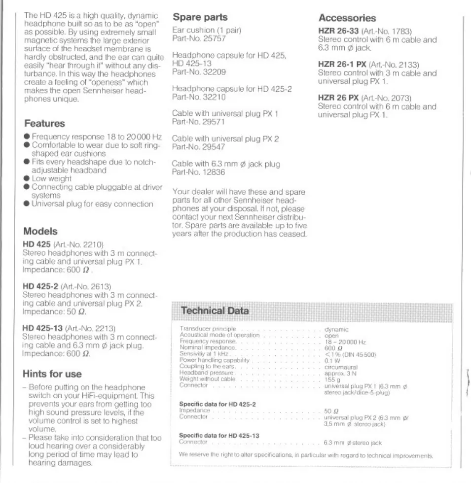 Sennheiser HD 425 - Features; Spare Parts; Accessories; Technical Data