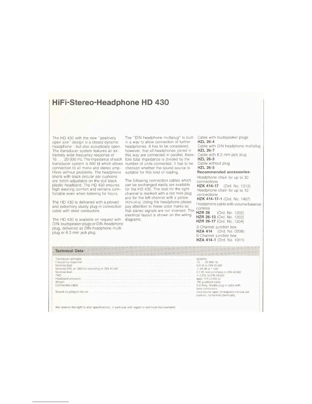 Sennheiser HD 430 - Accessories; Technical Data