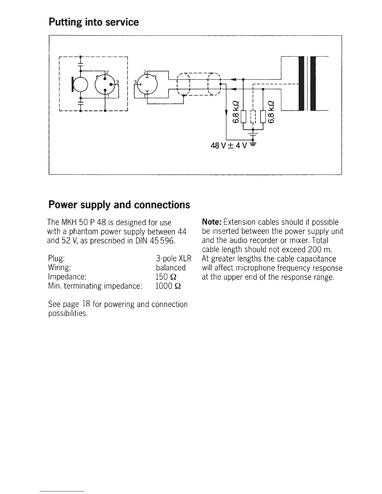 Sennheiser MKH 50 - Putting Into Service; Power Supply and Connections