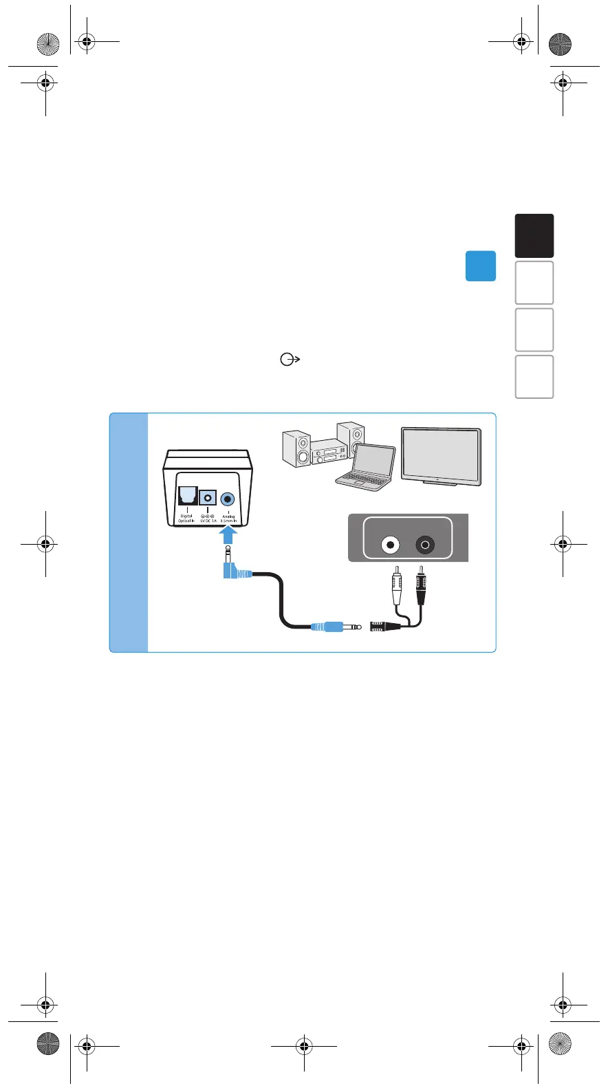 왘 Connect the stereo audio cable to the blue 3.5 mm jack