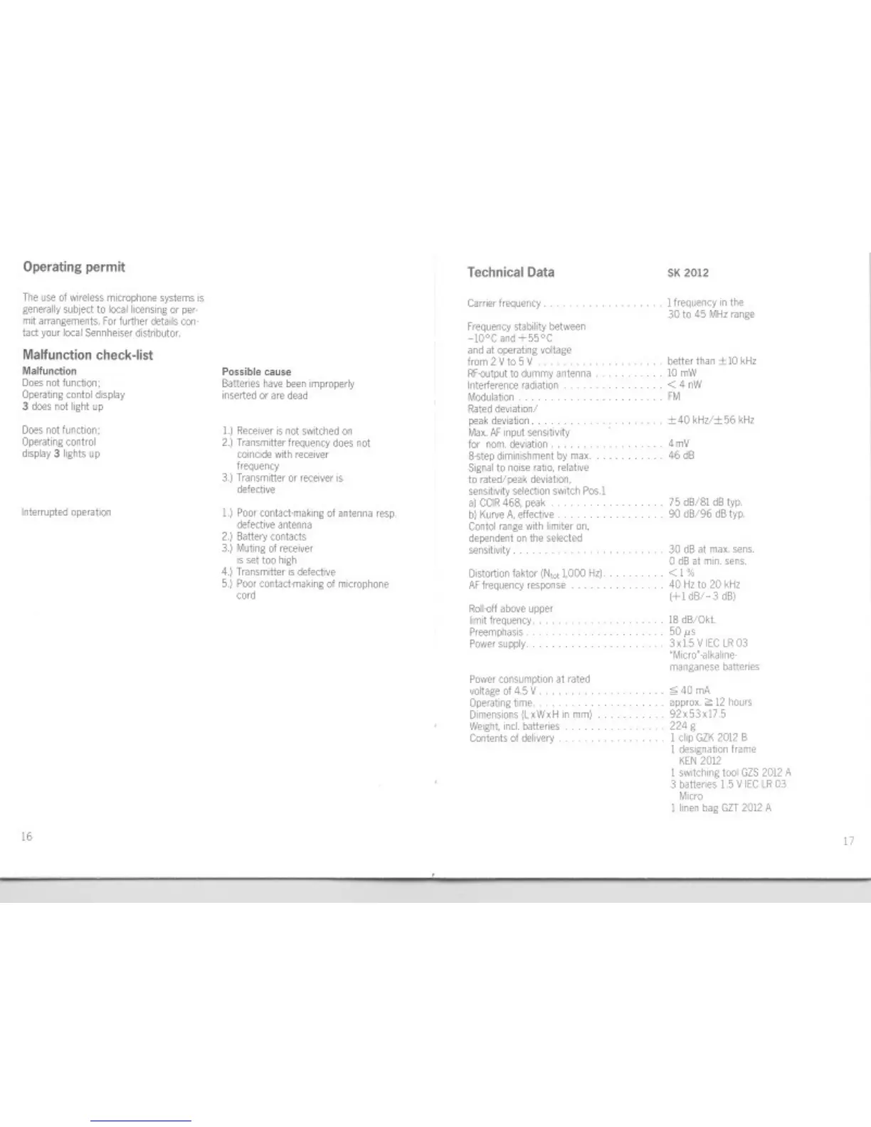 Sennheiser SK 2012 - Operating permit; Malfunction check-list; Technical Data