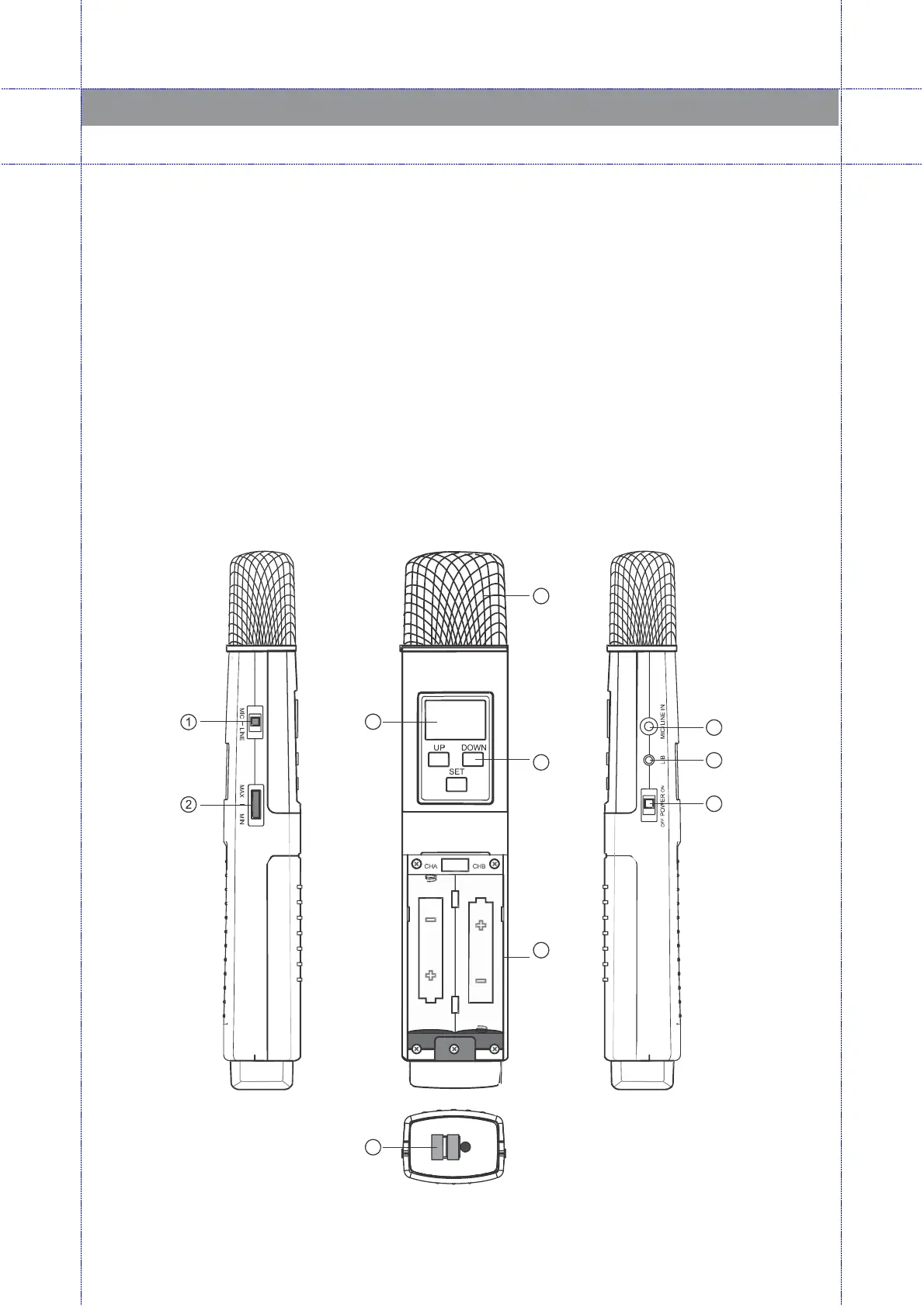 1. Function selections : switch on Mic when use input/output Mic or switch Line on