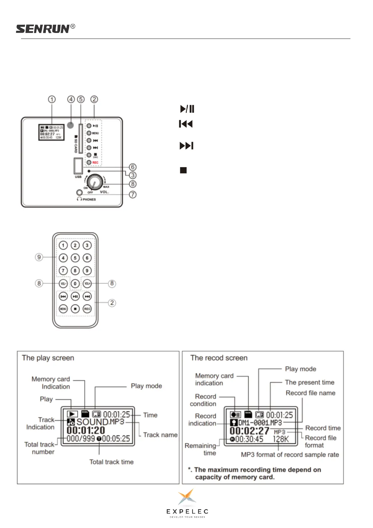 1. Afficheur: Indiquer par 'lecture', 'enregistrement', d'autres