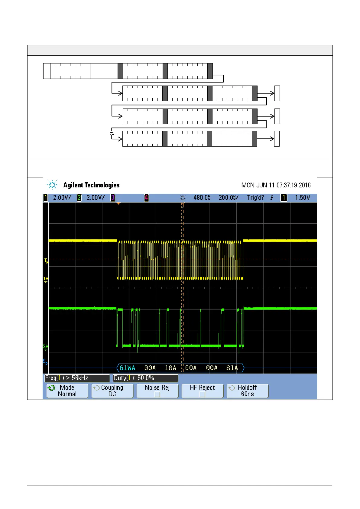 (Red: Write Header; Blue: Read Header; Black: Data; Green: CRC; Start Condition: START; Stop Condition: STOP)