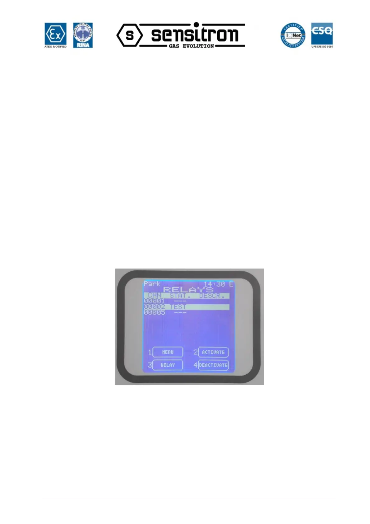 The relays in TEST status can be activated and deactivated by the options 2-ACTIVATE