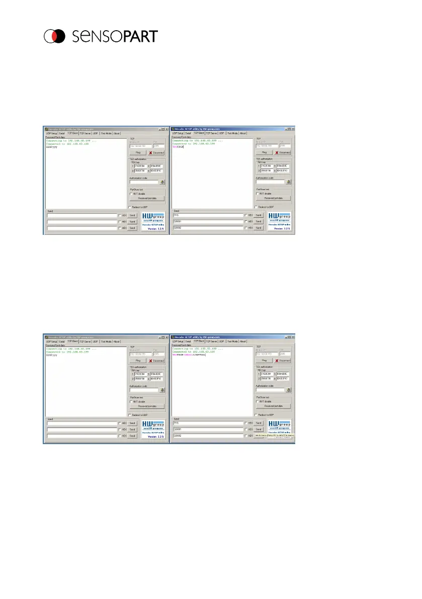 In the right window (Port 2006), the command TRG (Trigger, see "Send" below, first line) was