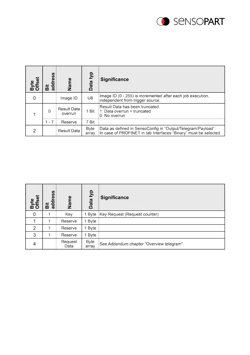 Sensopart Visor - 6.3 Module 3: Data (from VISOR to controller); 6.4 Module 4: Request (from controller to VISOR)