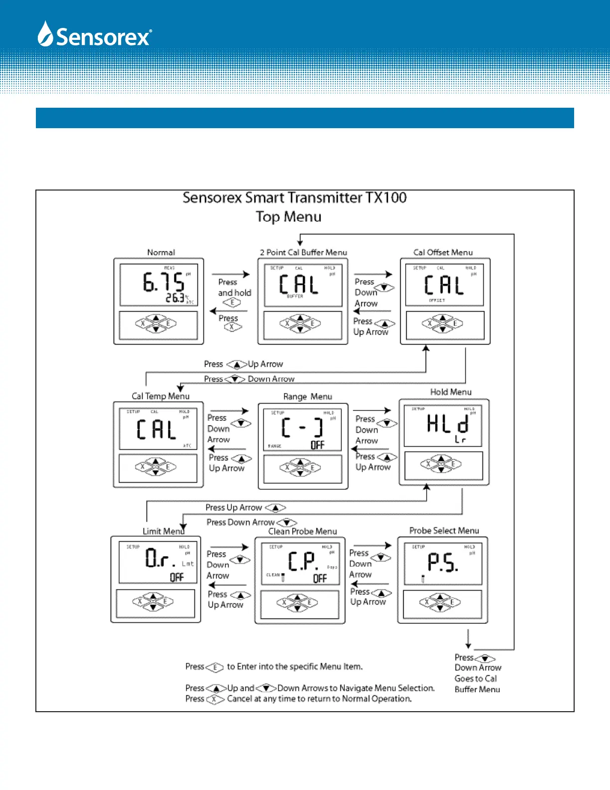 The TX100 pH/ORP transmitter menu ow chart below shows a quick view of navigation basics. For detailed