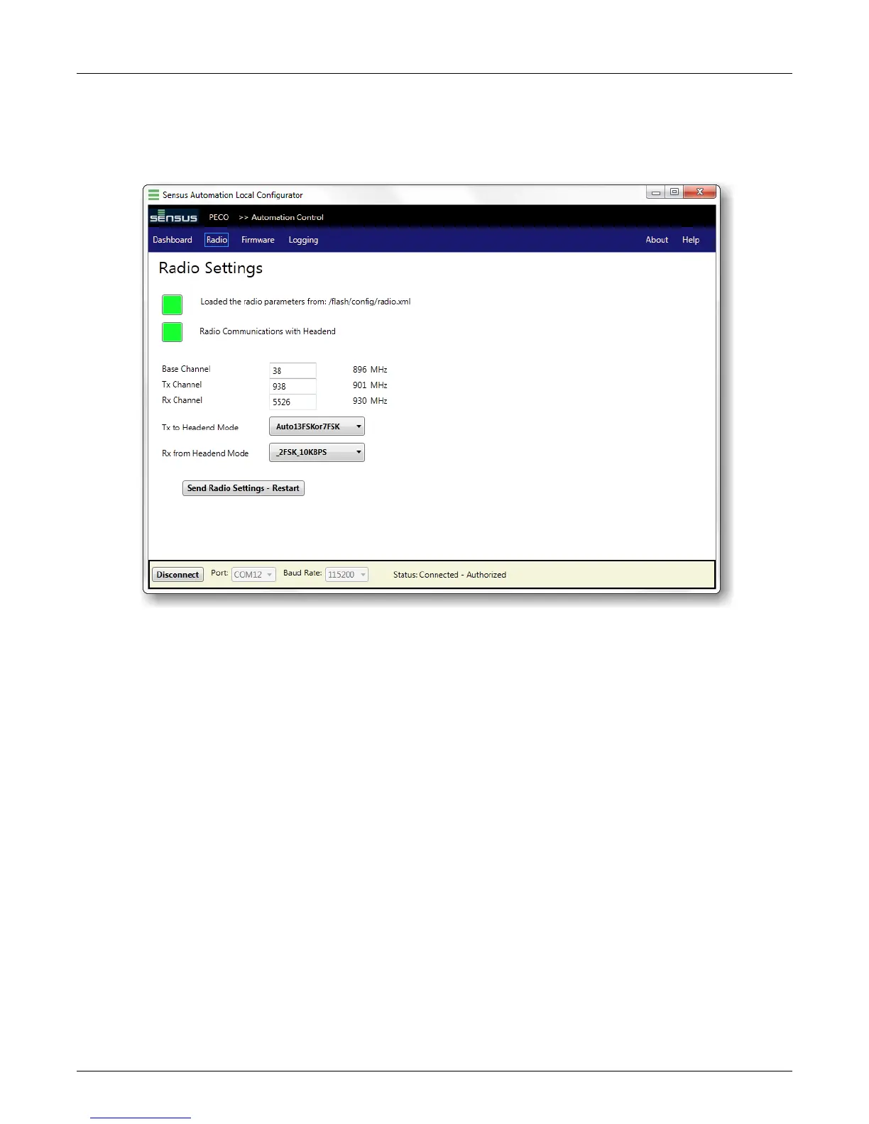 ◦ Send Radio Settings - Restart: If this button is red, it means no radio parameters are loaded.