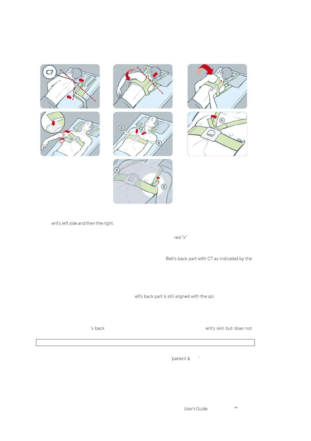 • Place the belt aside the patient with the striped fabric of the left belt flap facing upwards and oriented