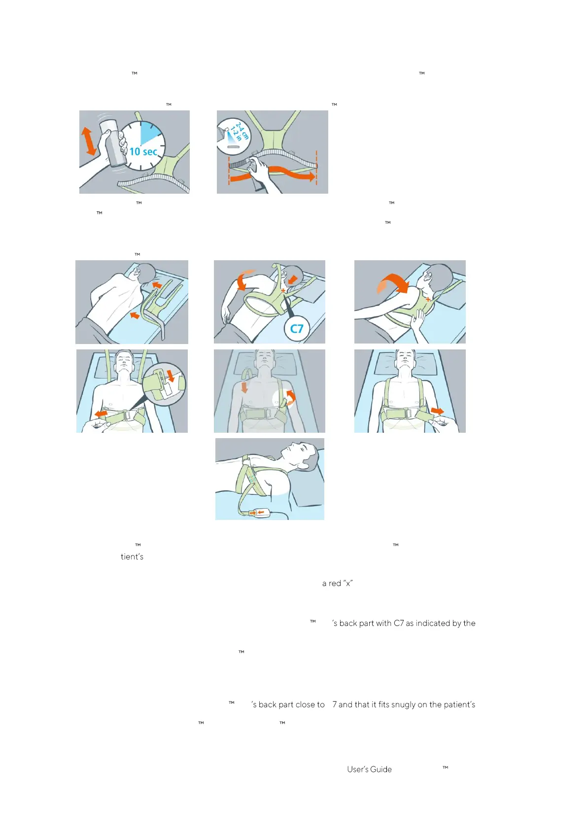 • Place the belt aside the patient with the striped fabric of the left belt flap facing upwards and oriented