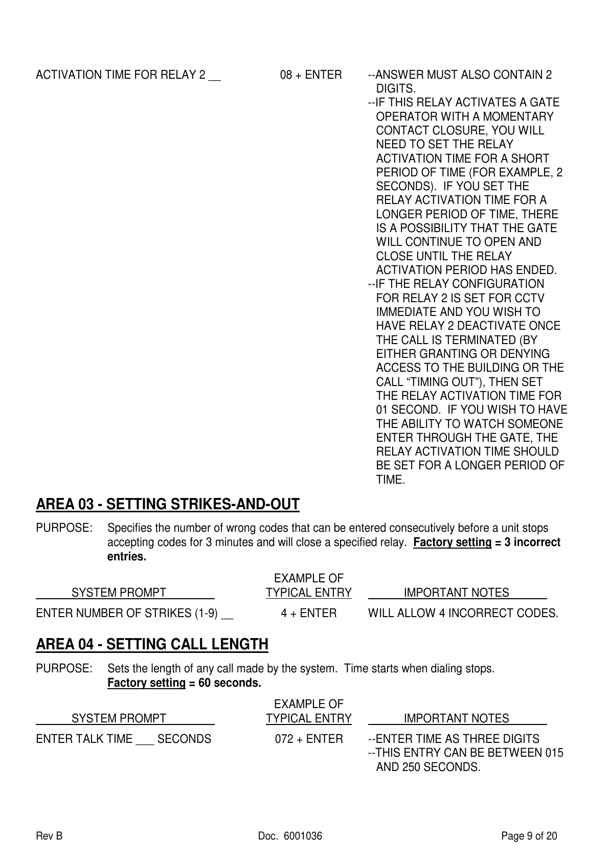 accepting codes for 3 minutes and will close a specified relay. Factory setting = 3 incorrect