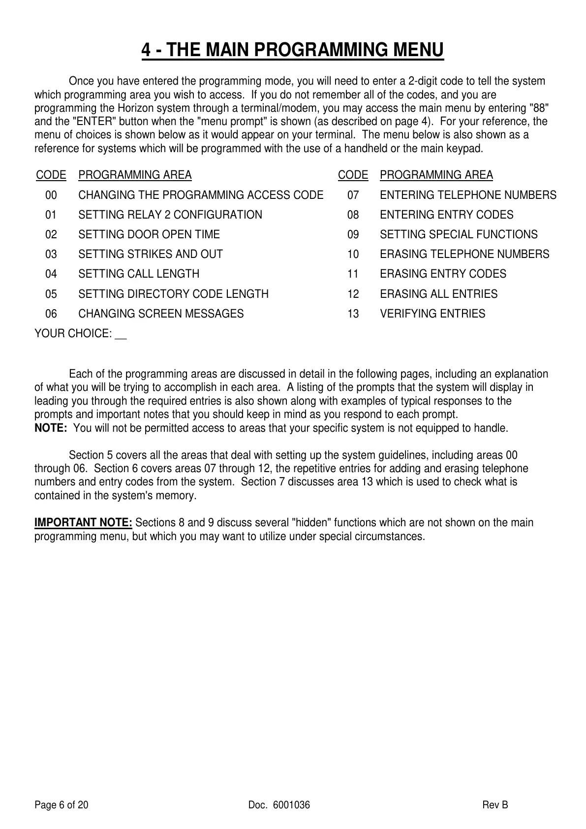 programming the Horizon system through a terminal/modem, you may access the main menu by entering "88"