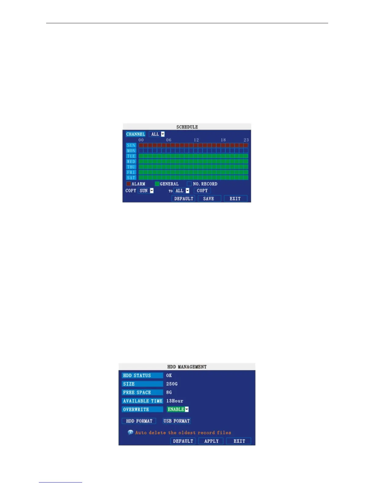 DAILY: There are three modes: ALARM, NORMAL and NO REC. If you select one mode, the whole day