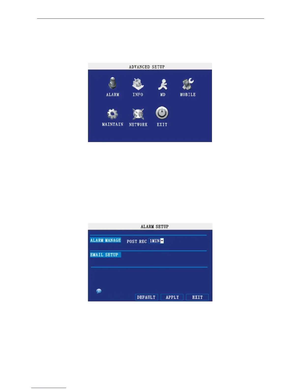 Move the cursor to 【ALARM SETUP】 (Icon highlighted when selected), press 【Enter】 to access the