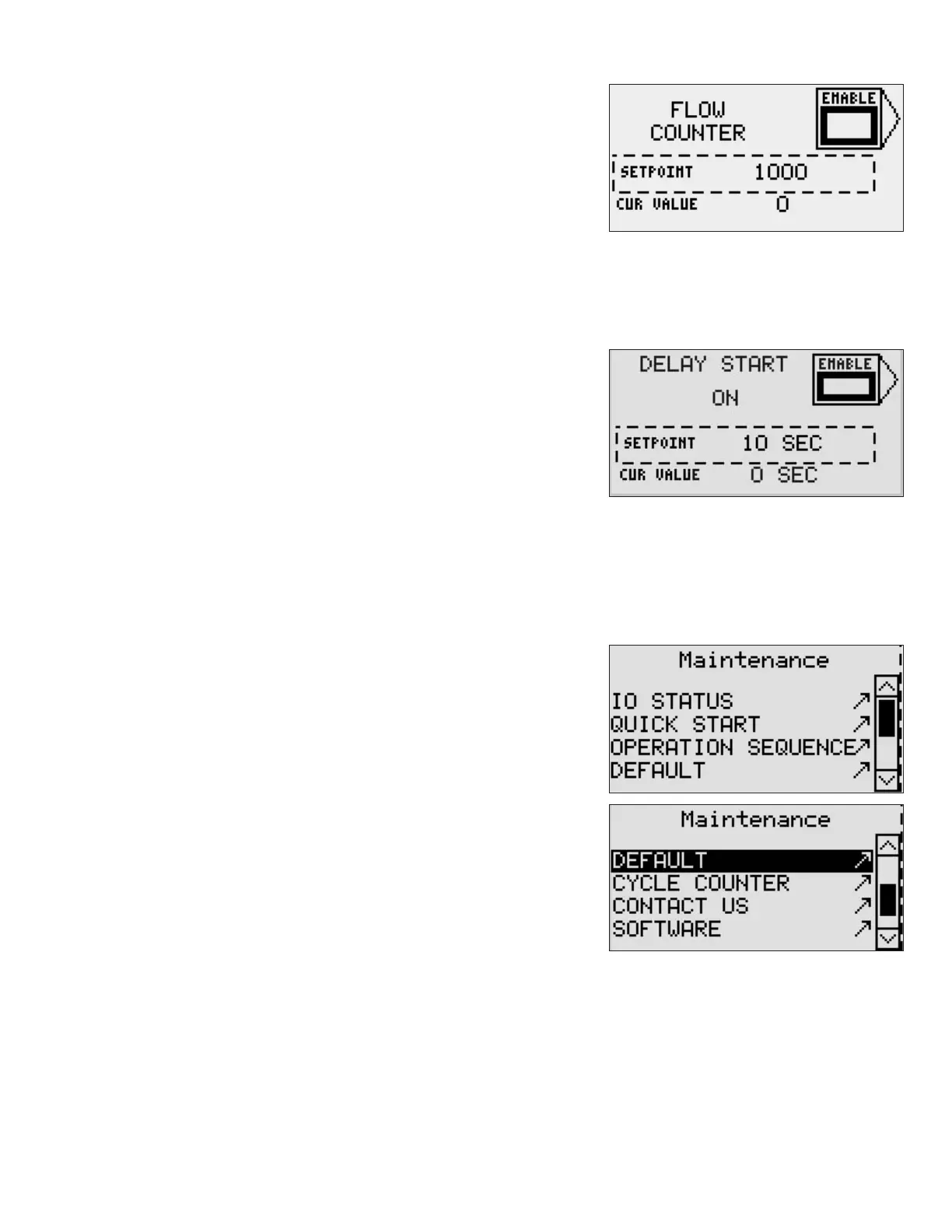 The Delay Start option is enabled using the Enable soft key. Setpoint value is entered using the ENTER, UP and DOWN