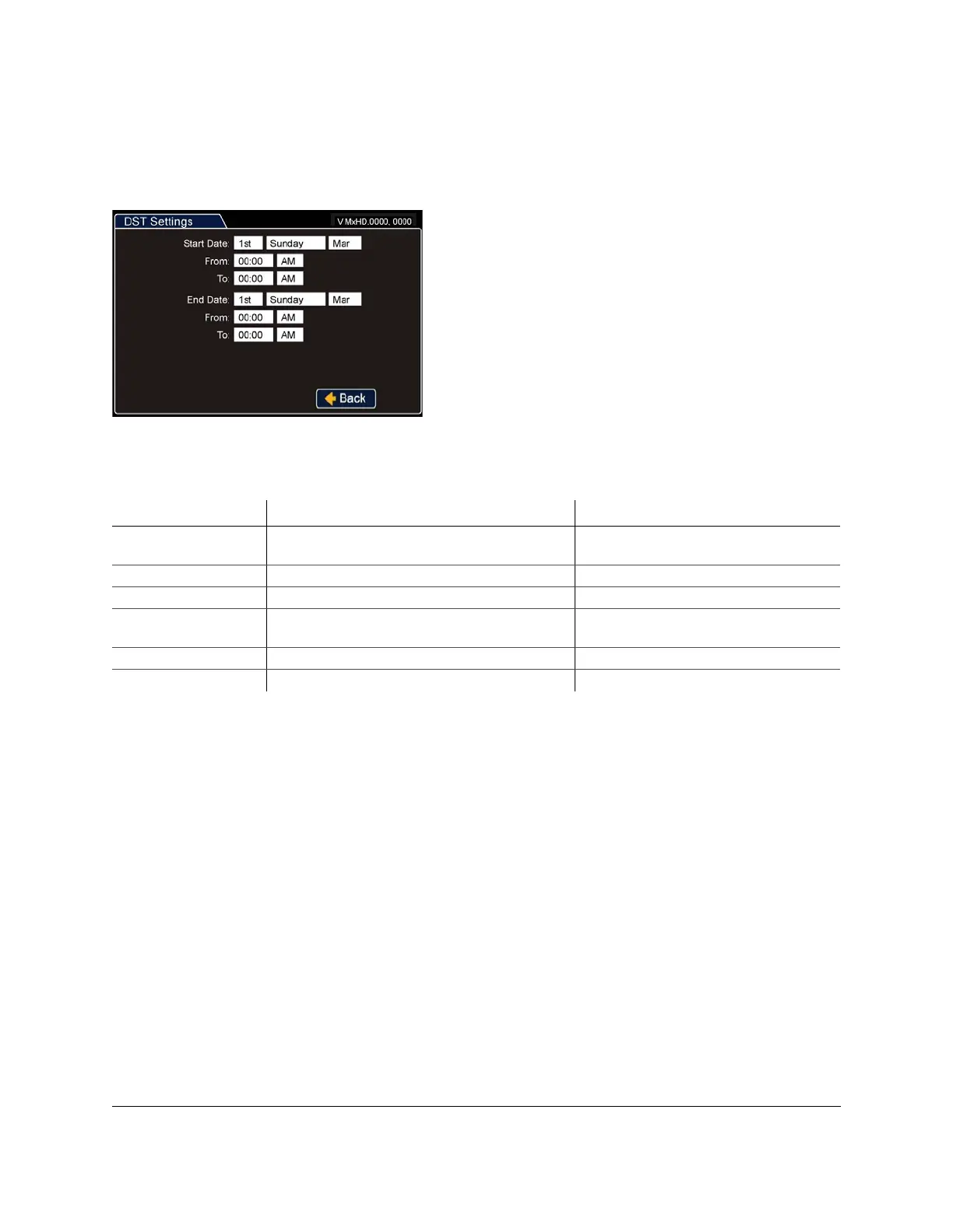 Configure the start date or end date settings for daylight savings. The DST Settings sub-menu is shown in