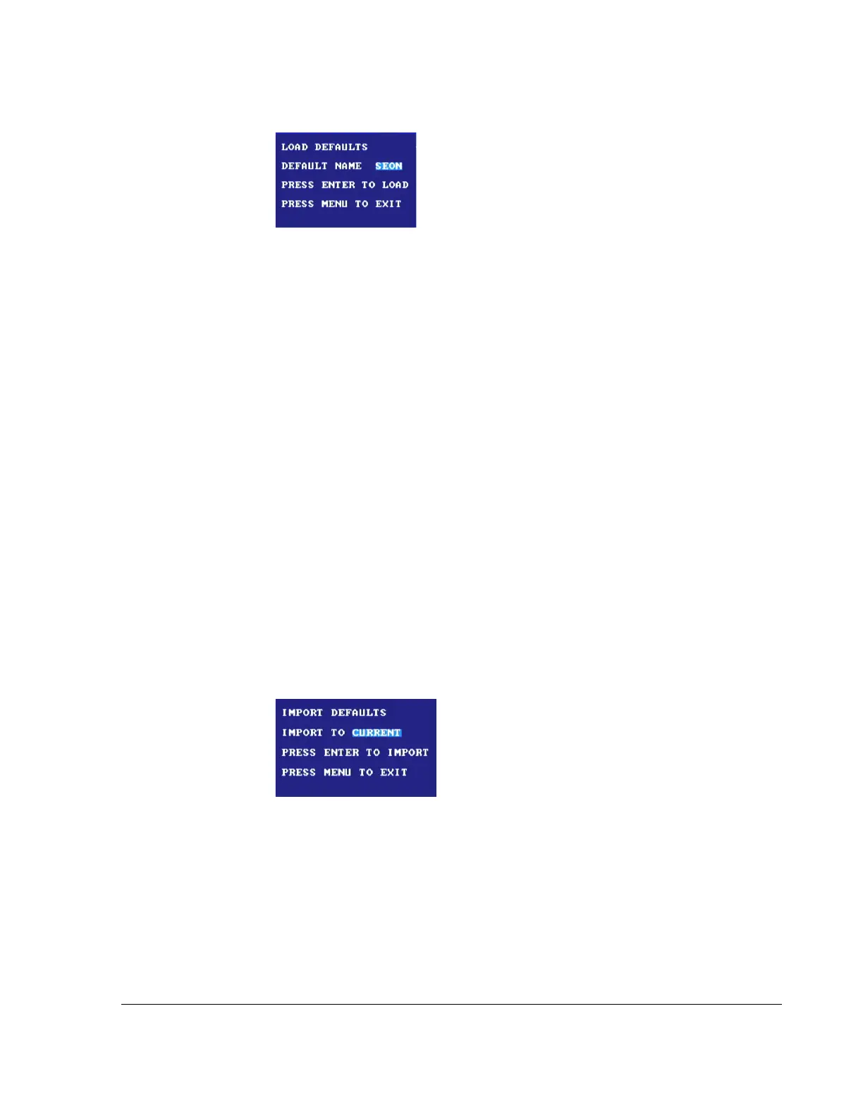 IMPORT DEFAULTS menu, press the ENTER button.