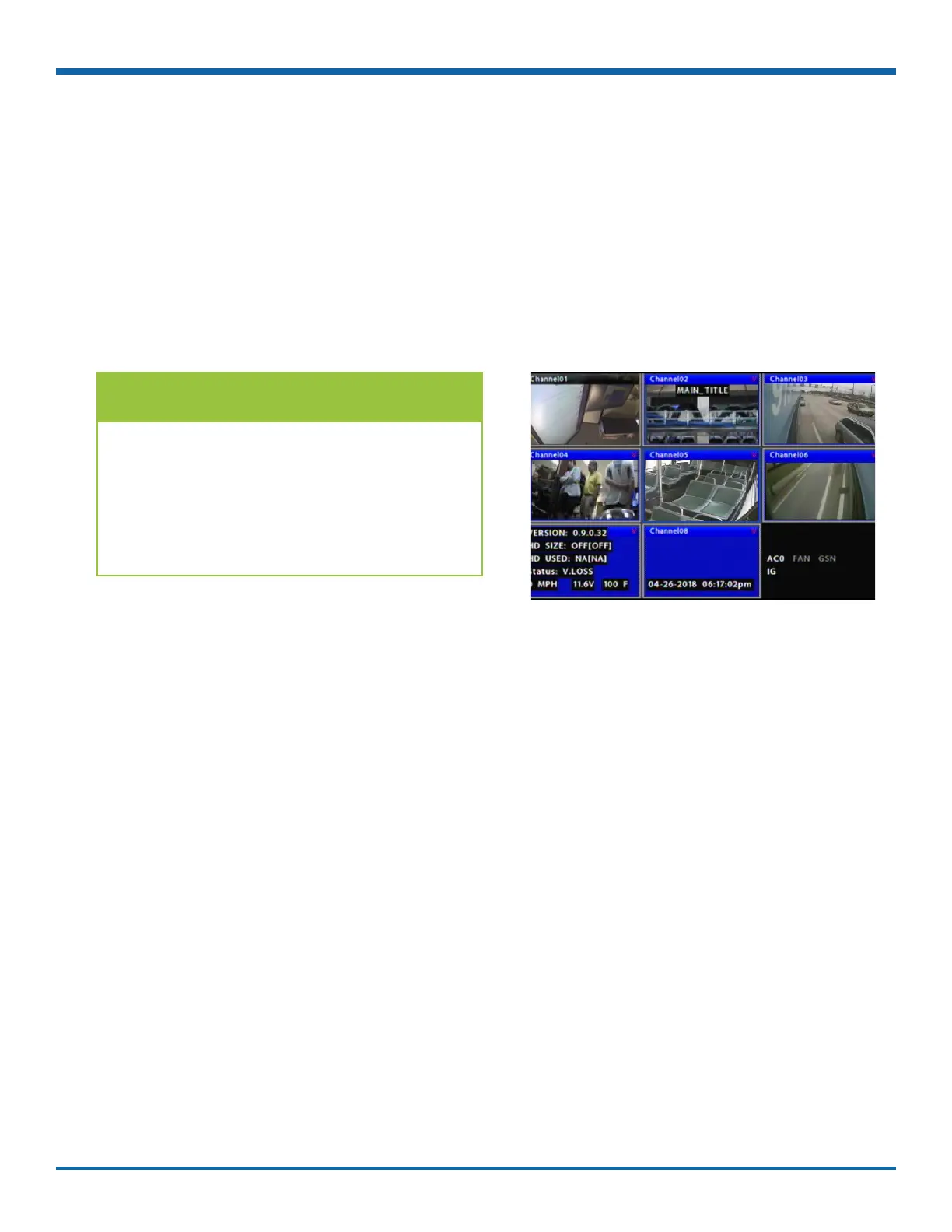 • Camera feeds - including the sequence of tiles: see "Ch (logical channel)" in "Camera Settings - Menu