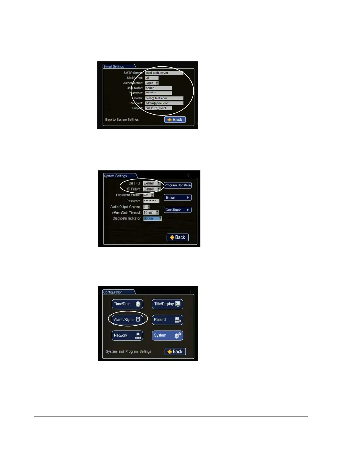 7. In the System Settings menu set the Disk Full and HD Failure options to E-mail.
