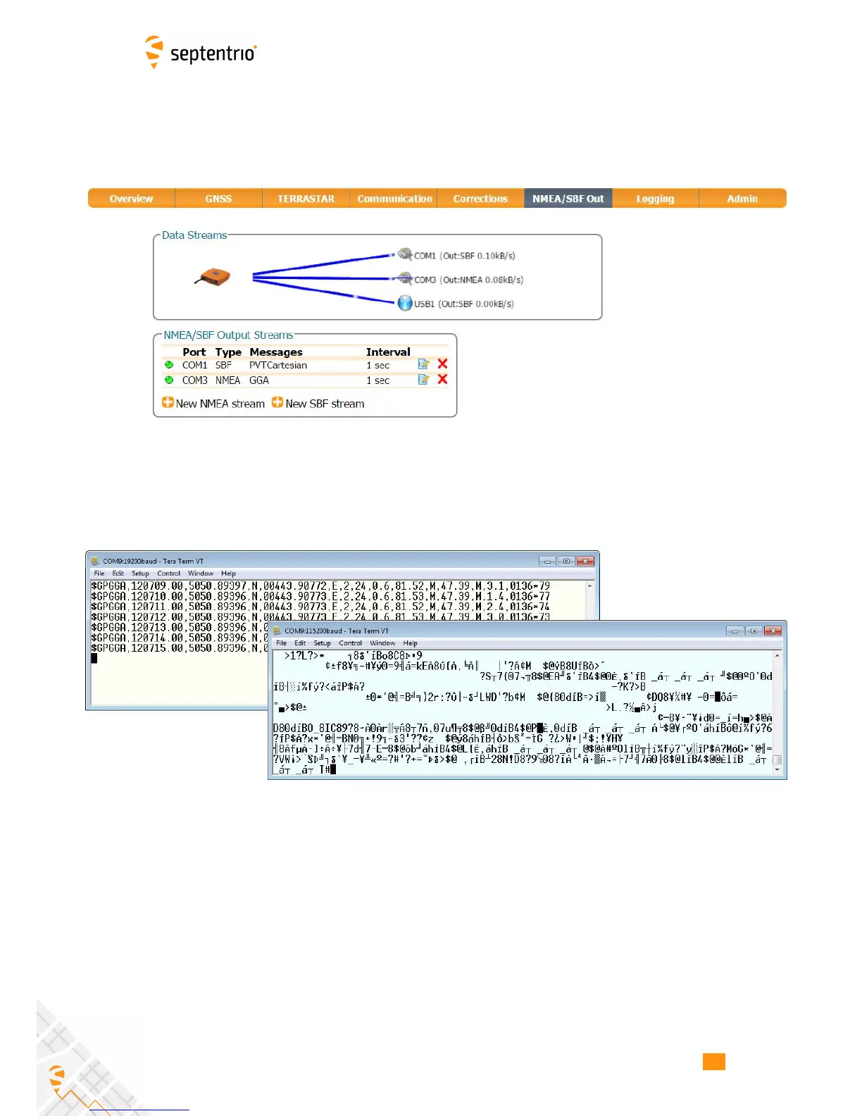 Figure 3-17: Example showing output NMEA GGA (left panel) and SBF