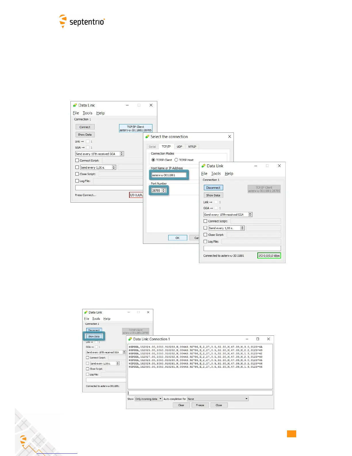 The screenshots in Figure 3-20 show how the Septentrio GUI tool Data Link can be configured