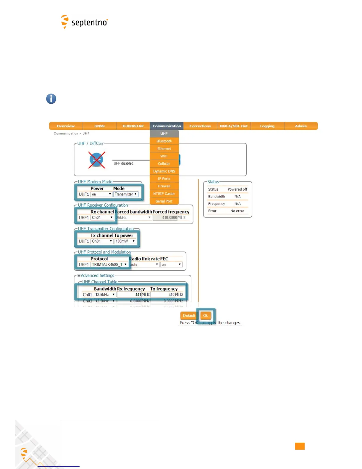 The UHF radio can be configured in the ‘UHF’ window. In the example show in Figure 5-4, the