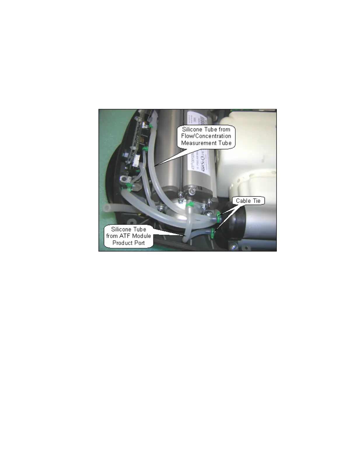 2. Cut the 2 green cable ties that secure the silicone tubes to the top of the Product Tank as shown