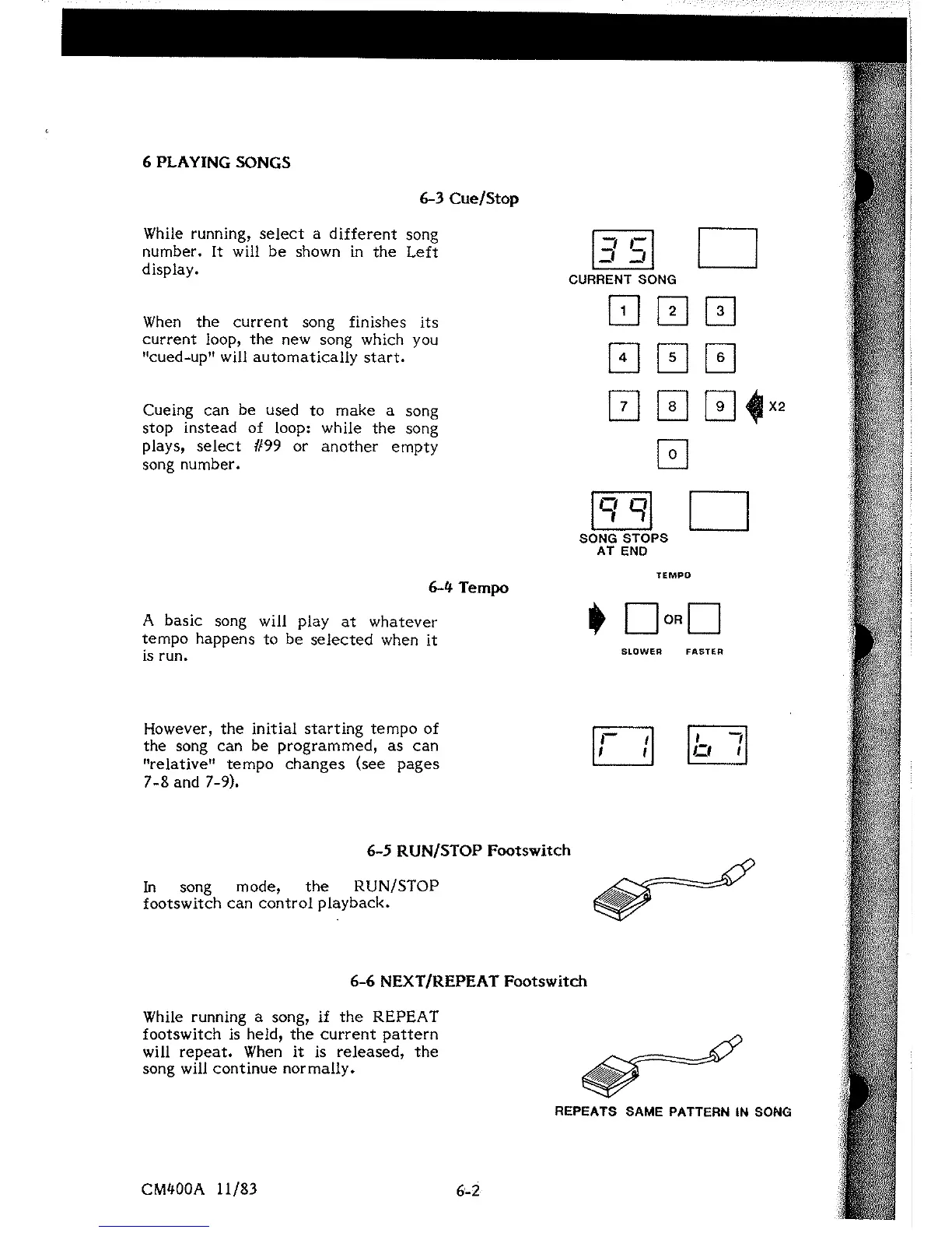 Sequential Drumtraks 400 - Cue;Stop; Tempo; RUN;STOP Footswitch; NEXT;REPEAT Footswitch