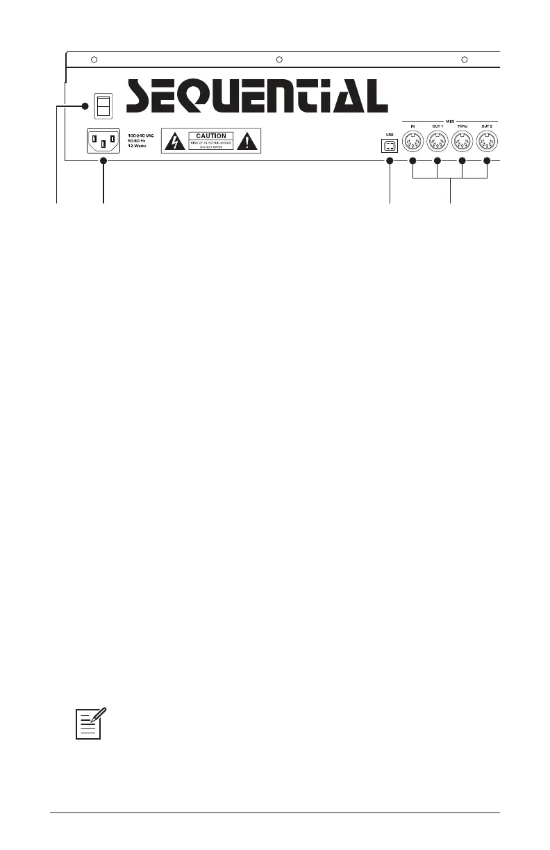 The rear panel of the Pro 3 has connectors for power, USB, MIDI, audio,