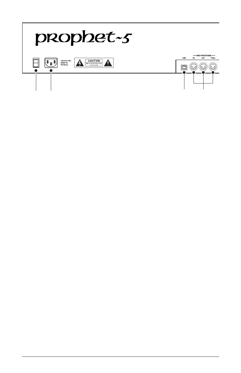 The rear panel of the Prophet-5 has connectors for power, USB, MIDI,