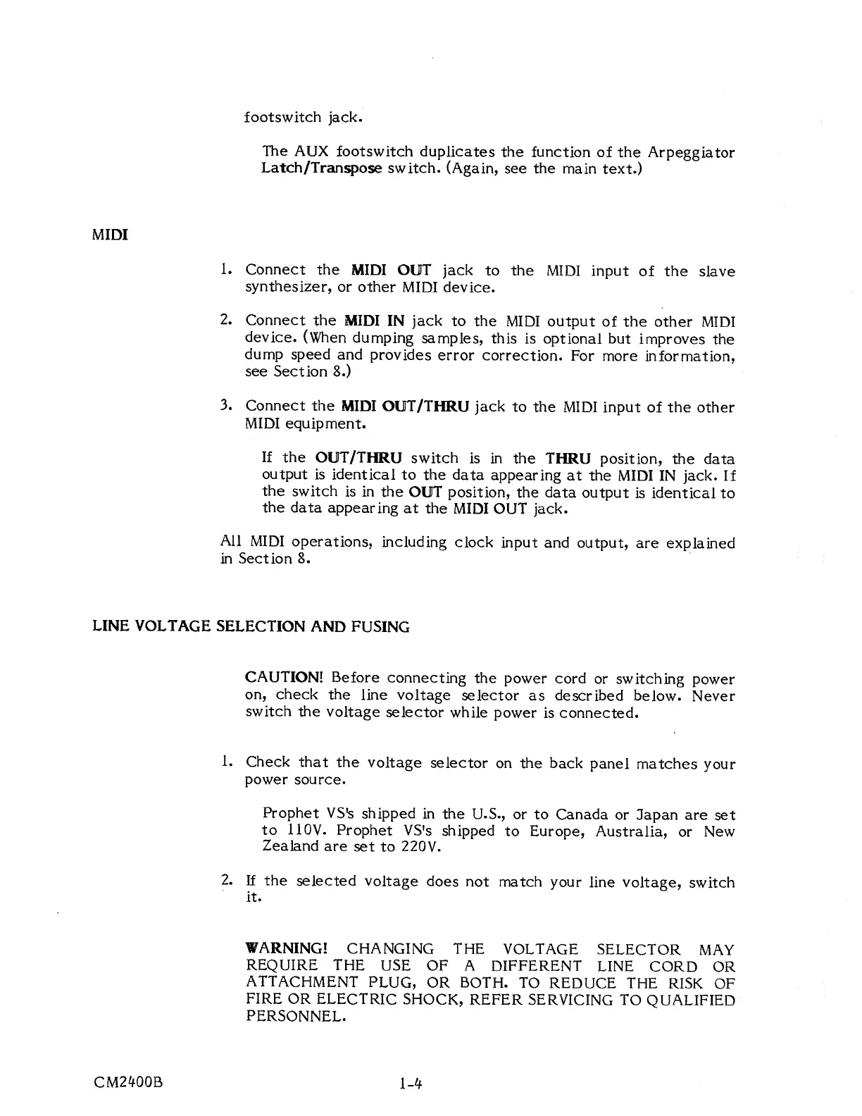 Sequential Prophet VS - MIDI CONNECTIONS; POWER AND VOLTAGE
