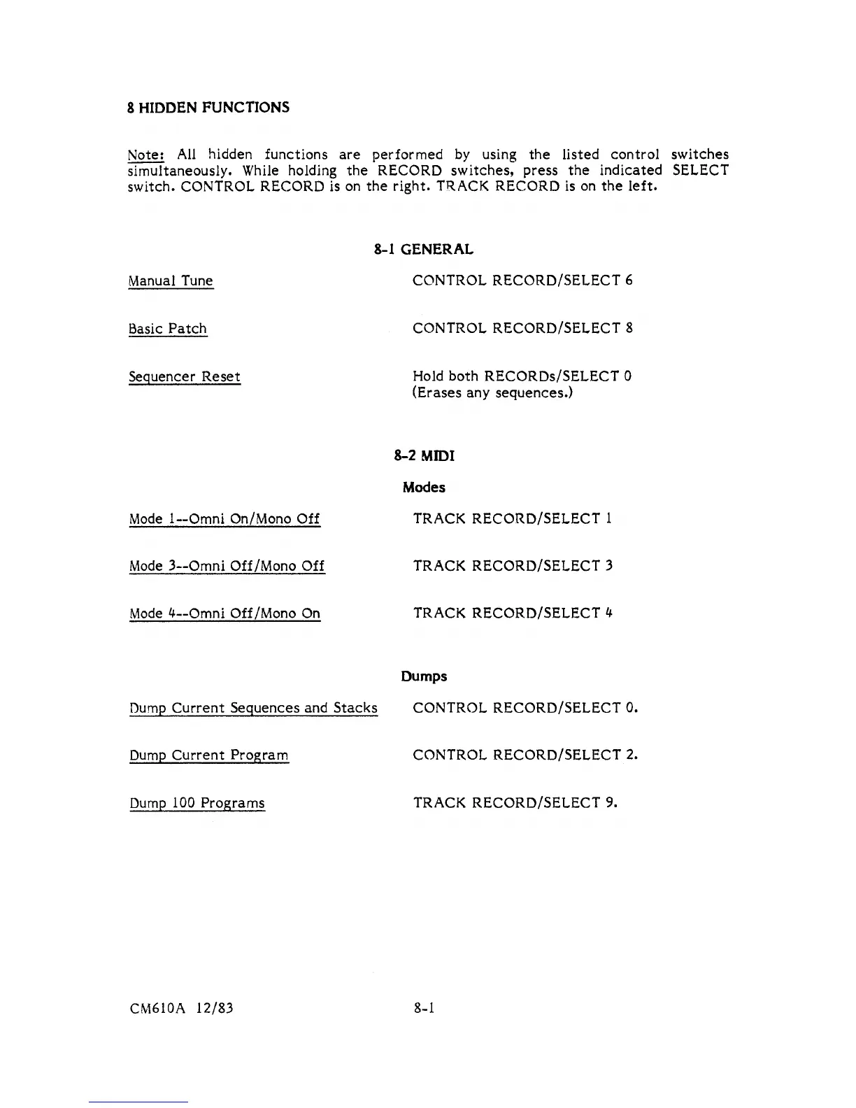Sequential Six-Trak - 8 HIDDEN FUNCTIONS; 8-1 General Hidden Functions; 8-2 MIDI Hidden Functions