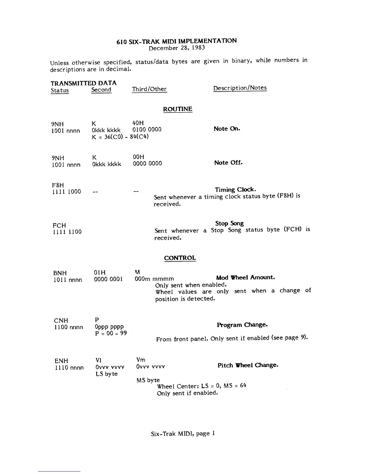 Sequential Six-Trak - 610 SIX-TRAK MIDI IMPLEMENTATION; Transmitted Data Status; Routine MIDI Commands; Control MIDI Commands